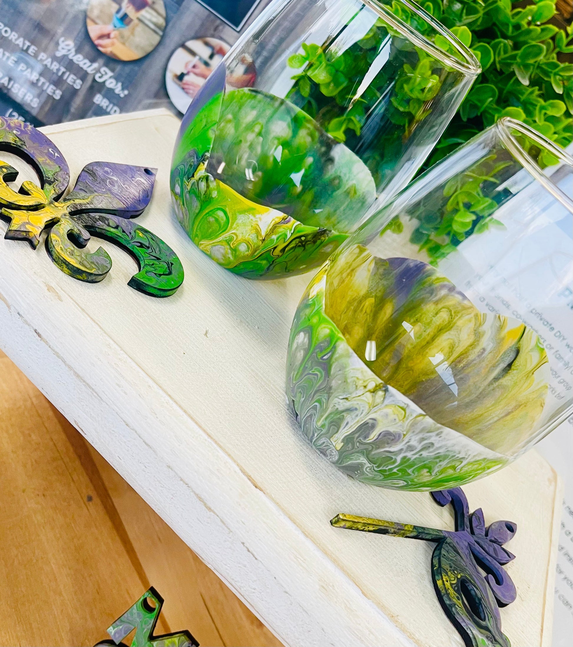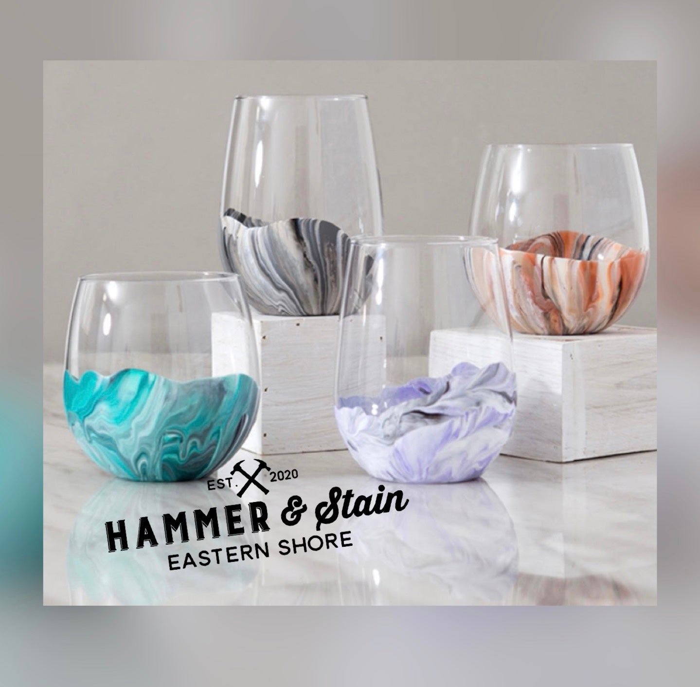 Create with us at Hammer and Stain Eastern! Bring along your friends, family or colleagues for a fun and guided workshop where you will make a set of gorgeous marbled dipped stemless wine glasses. Set of four. ALL GLASSES MUST REMAIN ON SITE 24-48 HOURS TO CURE & BE SEALED. Due to hand made nature of project, glasses are hand wash only.